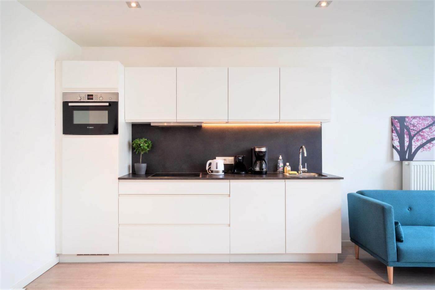 One-Bedroom Apartment. This spacious apartment is comprised of 1 living room, 1 separate bedroom and 1 bathroom with a shower and free toiletries. Guests can make meals in the kitchen that comes with a stovetop, a refrigerator, kitchenware and an oven. The apartment features parquet floors, a seating area, a private entrance, a tea and coffee maker as well as city views. The unit offers 4 beds and 1 futon.