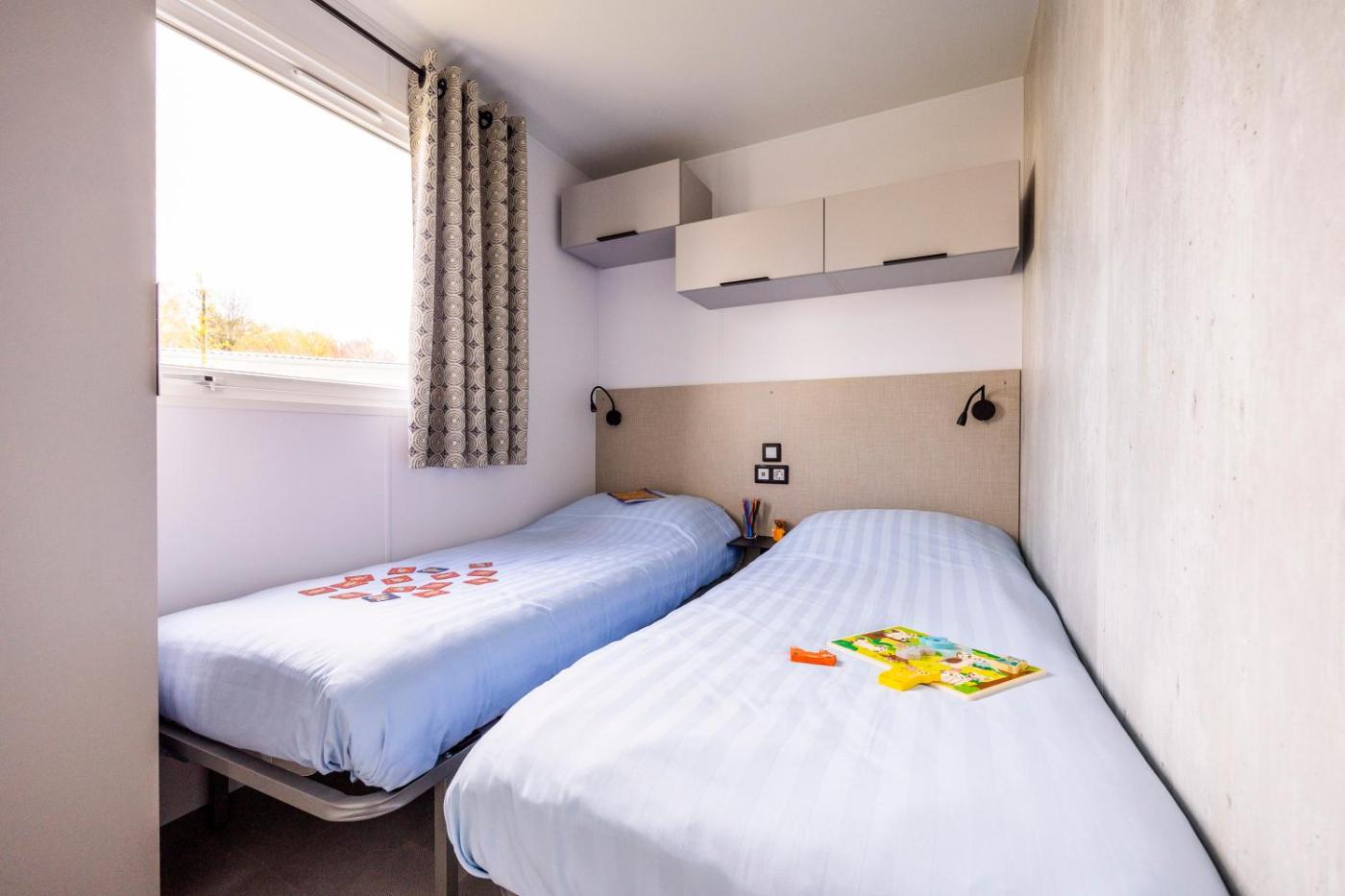 Stacaravan 6 personen (3 slaapkamers). Boasting a private entrance, this mobile home features 1 living room, 3 separate bedrooms and 1 bathroom with a shower. In the fully equipped kitchen, guests will find a stovetop, a refrigerator, a dishwasher and kitchenware. This mobile home has a coffee machine, a seating area, a TV with cable channels and a terrace. The unit has 5 beds. ;