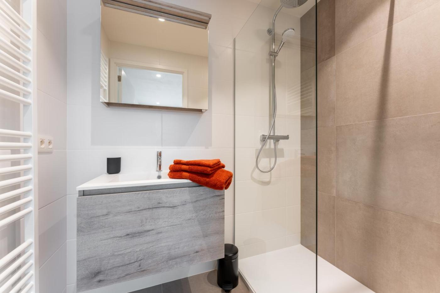Two-Bedroom Apartment. This spacious apartment comes with 1 living room, 2 separate bedrooms and 2 bathrooms with a walk-in shower and free toiletries. Guests can make meals in the kitchen that features a stovetop, a refrigerator, a dishwasher and kitchenware. Boasting a terrace, this apartment also features a washing machine, a private entrance and a flat-screen TV with streaming services. The unit has 3 beds.